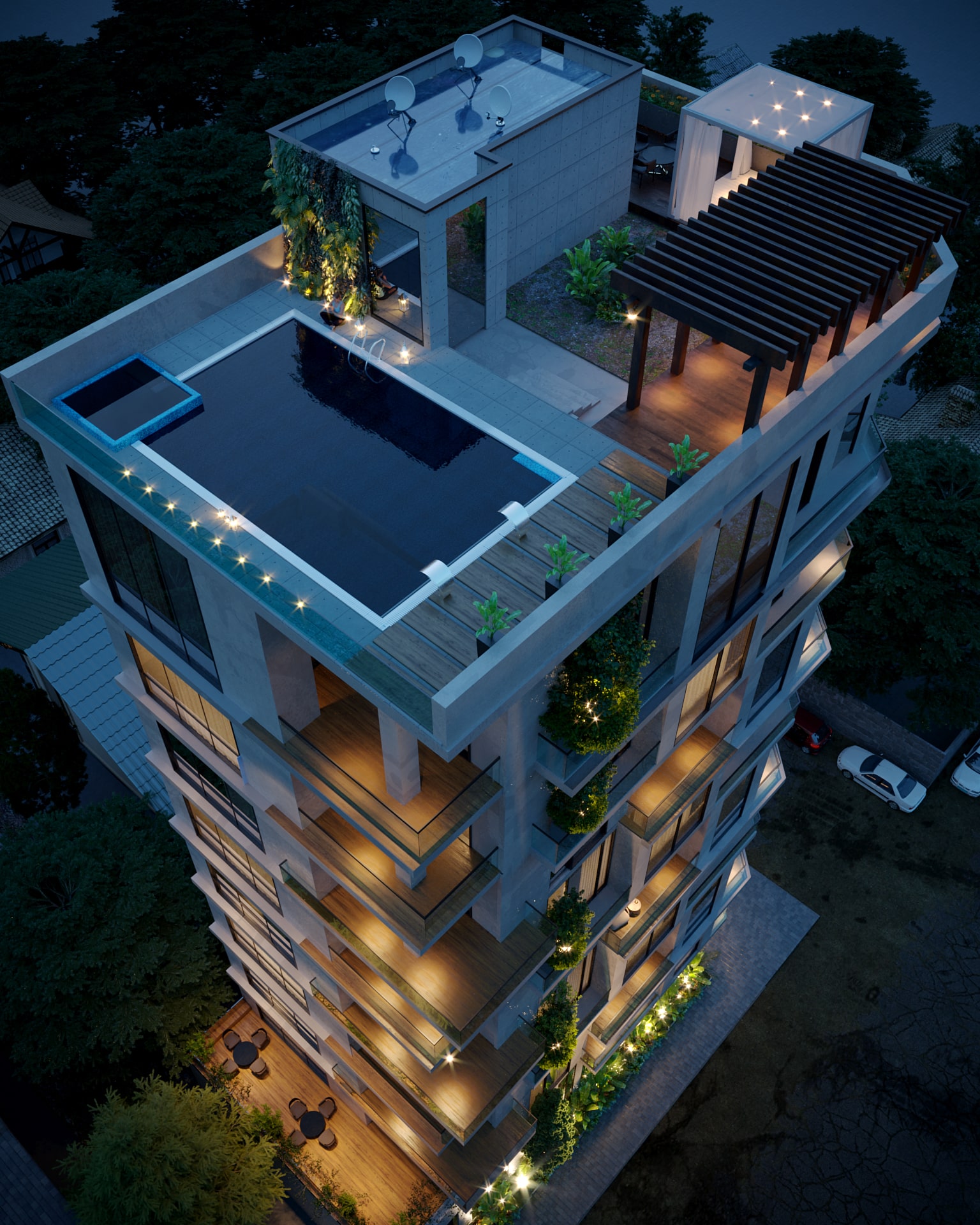 مشاعات: استخر روی روف گاردن با نمای جنگل و دریا، پارکینگ، لابی، آسانسور ، جکوزی